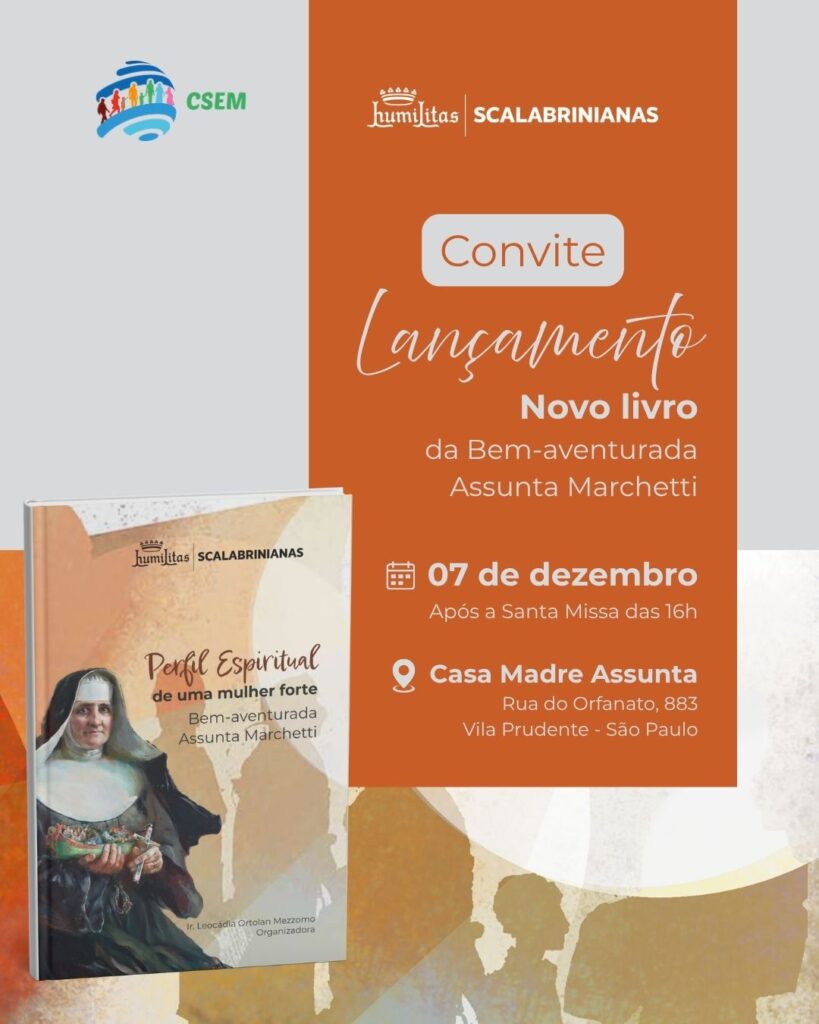 No dia 07 de dezembro acontecerá na Casa Madre Assunta, na Vila Prudente, São Paulo/SP, o evento de lançamento do livro “Perfil Espiritual de uma Mulher Forte: Bem-aventurada Assunta Marchetti”. O evento será realizado após a Santa Missa das 16h.